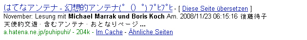 ![]() Seit Mitte Oktober war ich gerade mal 13 Tage zuhause, 9 davon unfreiwillig mit Grippe und Bronchitis, dem obligatorischen Buchmesse-Mitbringsel. Den Rest verbrachte ich zumeist im Haus meines Vaters, mit spaßigen Beschäftigungen wie dieser, oder um Bank- und Behördenkram zu erledigen. Oder ich musste nach Stuttgart, um Gerichtsverhandlungen beizuwohnen und noch mehr lästigen Behördenkram zu erledigen. Zeit ist ein Luxus, den ich irgendwann Ende 2006 während des Umzugs nach Hannover verloren haben muss. Daher nachfolgend alle relevanten News kurz und kompakt, denn ich befinde mich bereits wieder mit einem Bein auf dem Weg nach Berlin zu einer Gemeinschaftslesung mit Boris Koch ... All-Age-Lesung in der Berliner Otherland-Buchhandlung am 29. November ![]() Lieber spät als gar nicht, und das im doppelten Sinne: Am Samstag, den 29. November, lese ich der Berliner Otherland-Buchhandlung aus DAS AION - KINDER DER SONNE, und zwar gemeinsam mit Boris Koch, der sein Buch DER DRACHENFLÜSTERER vorstellen wird. Beginn der Lesung ist um 20.00 Uhr, der Eintritt ist frei. Amüsant finde ich diesbezüglich nachfolgende Anzeige unserer Lesung auf einer japanischen Internetseite. Bin mal gespannt, wie viele Zuhörer aus Fernost sich am Samstag einfinden werden ... ![]() Was den "doppelten Sinn" der Headline betrifft: Ursprünglich war die AION-Premierelesung im Otherland bereits für Ende März 2008 geplant gewesen, fiel nach dem Ableben meines Vaters jedoch einer Lawine lästiger Verpflichtungen zum Opfer. AION-Dilogie ![]() Da ich nachfolgende Info vor einigen Monaten nur in einem PANORAMA-Beitrag "versteckt" hatte, hier noch mal das ganze offiziell: DAS AION wird keine Trilogie, sondern "nur" ein Zweiteiler. Da ich die Entwicklung der privaten Situation derzeit absolut nicht abzuschätzen vermag und ebenso wie der Verlag vermeiden möchte, dass zwischen dem Erscheinen von Teil 2 und Teil 3 womöglich noch einmal anderthalb Jahre vergehen, sind wir übereingekommen, die Geschichte von Miras Weltenbaum-Suche mit Band 2 abzuschließen. Dabei werde ich mir jedoch ein oder zwei Hintertürchen offen lassen, so dass zu einem späteren Zeitpunkt ein in sich abgeschlossener dritter AION-Roman oder sogar ein weiterer Zweiteiler folgen könnte. Die Geschichte wird jedoch nicht darunter leiden. Es wird nichts verloren gehen oder gar im Schweinsgalopp zu Ende erzählt werden. AION-Hörbuch verschoben auf Sommer 2009 ![]() Manch einem wird es aufgefallen sein: Die für Ende August angekündigte Audio-Ausgabe von KINDER DER SONNE ist nirgendwo zu finden. Der Grund dafür liegt einerseits im marketingtechnischen Bereich, andererseits in der generellen Verschiebung des zweiten AION-Teils um ein halbes Jahr. Jumbo bzw. GoyaLIT strebt nun eine Art "Doppelveröffentlichung" an. Soll heißen: Das Hörbuch von AION 1 erscheint kurz vor Veröffentlichung der AION 2-Buchausgabe oder sogar gemeinsam mit dem Hörbuch des zweiten Teils. So oder so verschiebt sich alles bis mindestens Sommer 2009. Work in progress ![]() Abschließend noch ein kurzer Projektüberblick, damit ich während der nächsten vier, fünf Monate auf Mails nicht ständig separat antworten muss, sondern für die nachfolgenden Absätze einfach nur die Copy-Paste-Funktion zu nutzen brauche ... ;-) Zur Veröffentlichung von THE BLACK MIRROR: Leider kenne ich kein genaues Erscheinungsdatum dieser in den USA veröffentlichten Anthologie deutscher und österreichischer Kurzgeschichten (siehe News vom 03.06.2008), in der meine immerhin schon zehn Jahre alte Story ASTROSAPIENS vertreten ist. Laut dem Herausgeber steht die Veröffentlichung zwar unmittelbar bevor (Stand 27. Oktober), doch die Zeitspanne des voraussichtlichen Erscheinens reicht auch bei den US-Internetbuchhändlern von Anfang Oktober 2008 bis Ende Februar 2009. Wait and see ... Neben den AION-Romanen werden bis Mitte 2009 zudem noch drei neue Kurzgeschichten erscheinen: Story Nummer 1 ist fertiggestellt und wird dem Herausgeber von mir kommendes Wochenende in Berlin quasi persönlich überbracht. Allerdings möchte ich vorerst nichts weiter über das Projekt erzählen - zumal dessen Vorstellung traditionsgemäß dem Herausgeber gebührt. Da die bei Beltz & Gelberg erscheinende Anthologie (soviel sei zumindest verraten) bereits im März erscheinen soll, wird die erste Verlagsmeldung allerdings auch nicht mehr so lange auf sich warten lassen. Auf das Schreiben von Story Nummer 2 - meinen längst überfälligen Beitrag für den im Basilisk-Verlag erscheinenden DUNWICH-Reiseführer - freue ich mich derzeit am meisten. Das liegt einerseits daran, dass ich ihr Konzept und ein Dutzend Seiten mit Notizen bereits im Oktober vergangenen Jahres erarbeitet habe, aber aus terminlichen Gründen bisher nicht zum Schreiben kam. Zugleich ist sie ein weiteres Kapitel jenes Episodenromans, an dem ich bereits seit 1999 sporadisch arbeite und wird unmittelbar an die Ereignisse von ENDEMION anknüpfen. Vielleicht gelingt es mir, im Anschluss daran gleich noch die INNSMOUTH-Episode für den geplanten Abschluss der Reiseführer-Trilogie zu schreiben - dann würden bis zur Vollendung des Romans nur noch drei Kapitel fehlen ... Story Nummer 3 wird ein Beitrag für die Jubiläumsausgabe Nr. 50 des Readers Digest-Jugendbuches. Dafür habe ich bisher zwar eine offizielle Einladung zur Mitarbeit, aber noch keine Idee, und die Deadline liegt auch noch in weiter Ferne - ganz im Gegensatz zu der des zweiten AION-Bandes, denn diese endet ... argh ... übermorgen! |